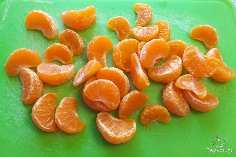 4. Мандарины почистить, поделить на дольки. Удалить ножом косточки, если будут, и обязательно, убрать белые перегородки, чтобы не горчили в выпечке.