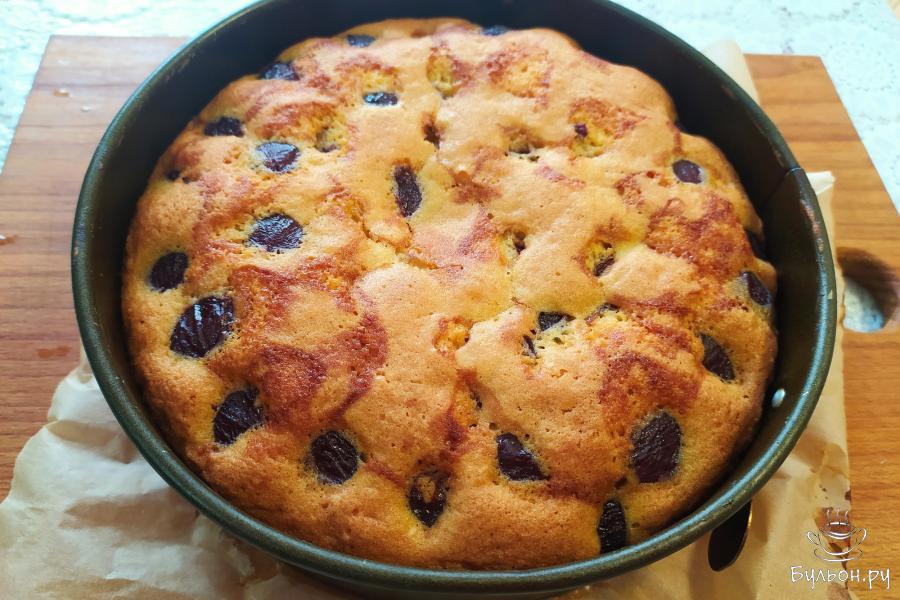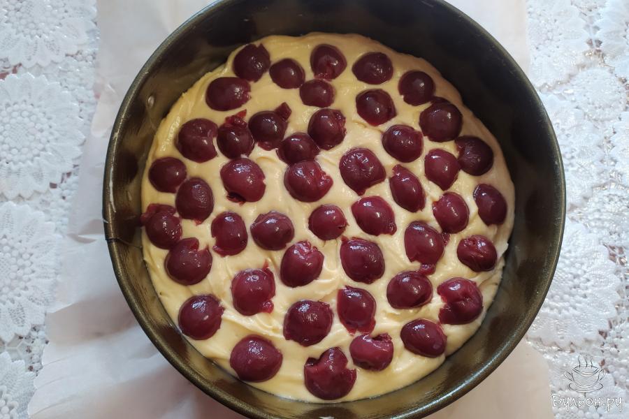 6. Покрыть мандарины оставшейся половиной теста. Вишню откинуть на сито, дать стечь жидкости. Выложить вишню на тесто, немного придавливая ее. Если вишня крупная, то разрезать ее пополам. Если вишня небольшая, то оставить ее целиком.