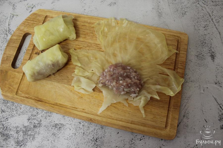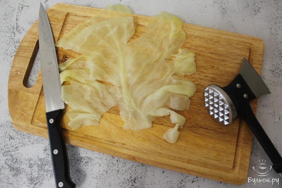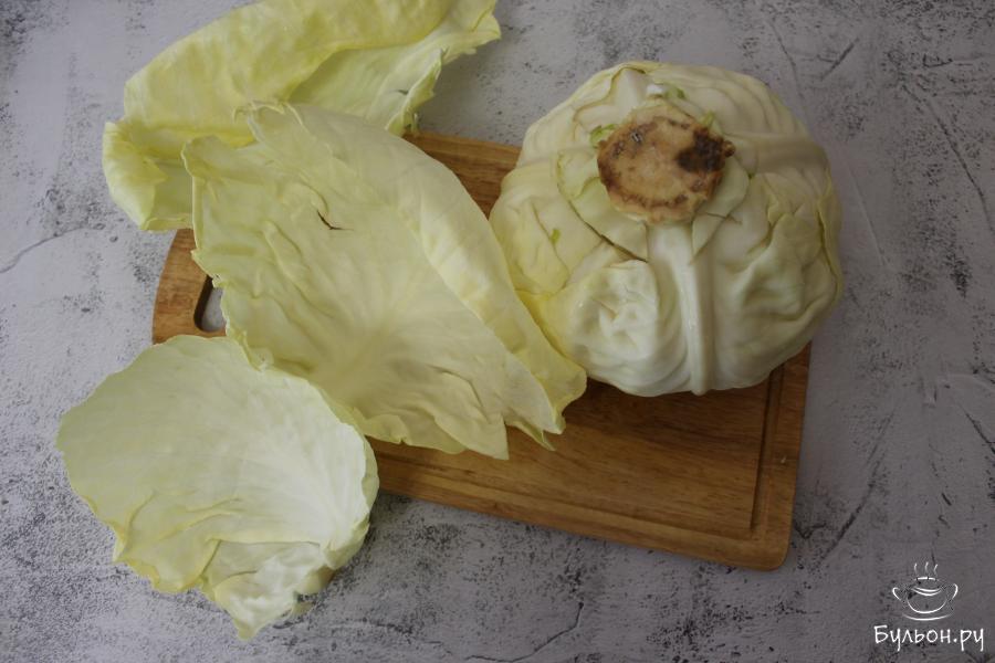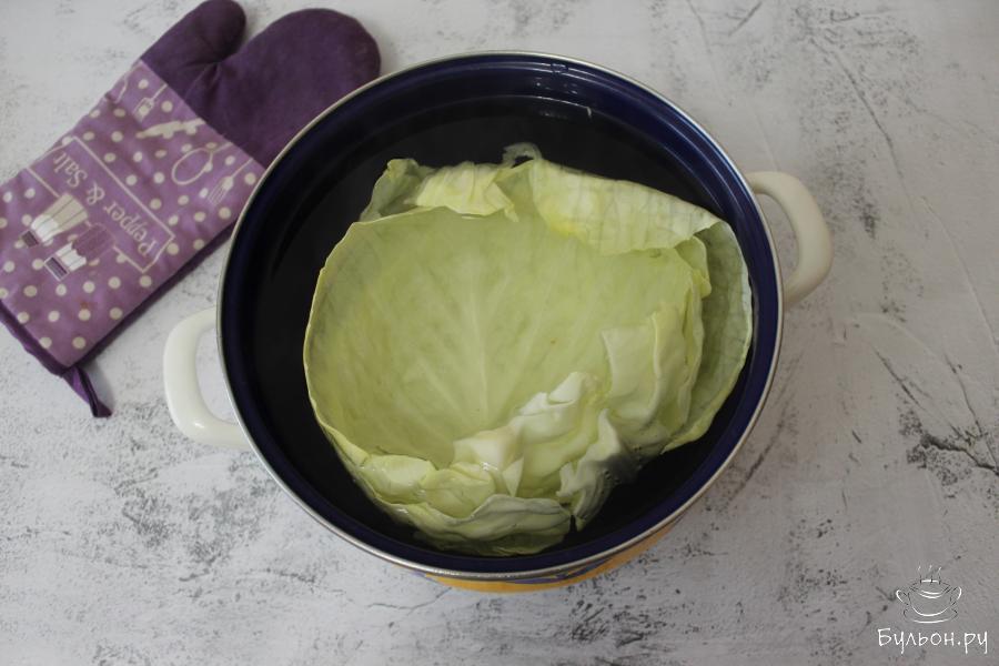 4. В большую, глубокую кастрюлю с кипящей водой, выкладывайте по несколько листиков капусты и кипятите по 3-4 минуты, чтобы листья стали мягкими.