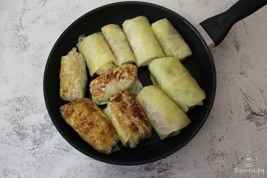 7. Свернутые голубцы выложите на сковороду с разогретым рафинированным маслом и слегка обжарьте с двух сторон.
