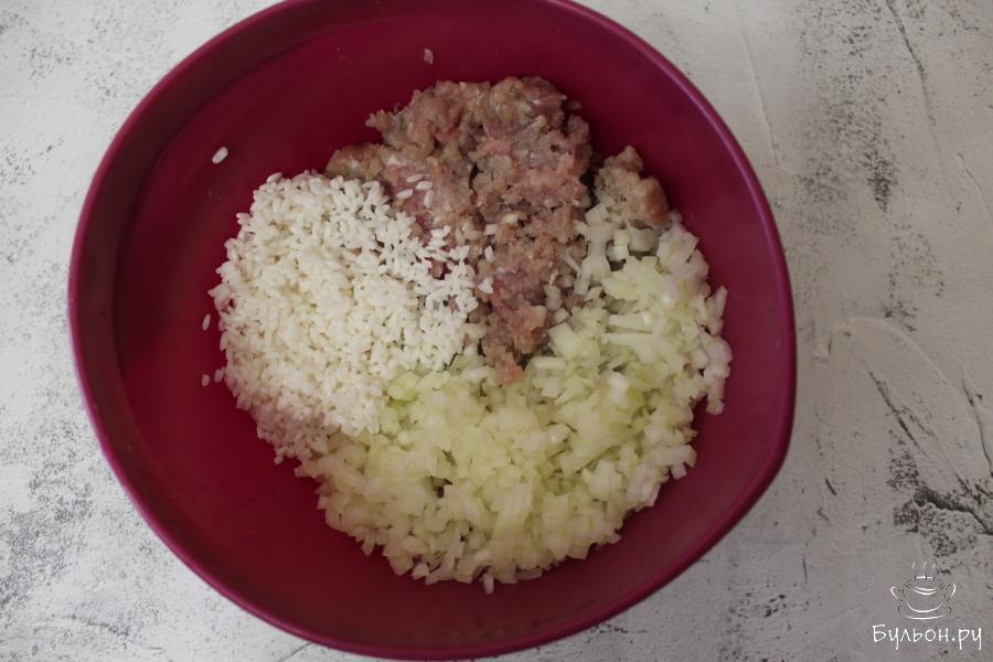2. Приготовьте начинку - смешайте свиной фарш, промытый рис и измельченную луковицу. Добавьте соль и перец, перемешайте.