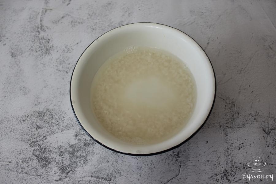 1. Круглозерный рис пересыпьте в мисочку и залейте кипятком так, чтобы весь рис был хорошо покрыт водой. В ингредиентах кипяток указан только для соуса. Здесь лучше ориентируйтесь на свою посуду. Дайте воде полностью остыть, после чего рис промойте под водой.