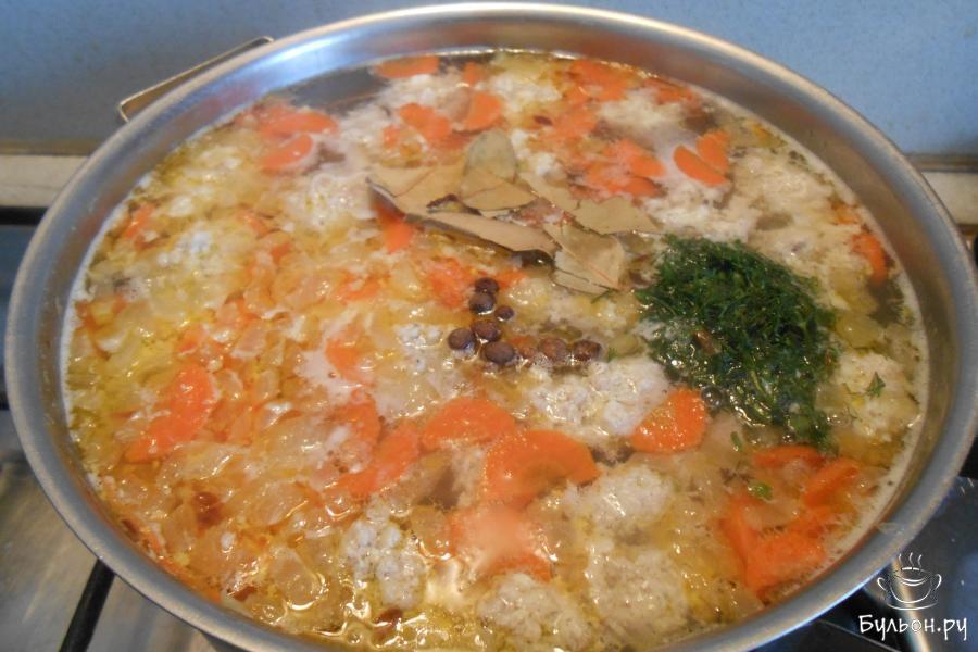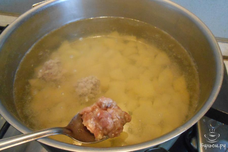 5. В кипящую воду добавить картофель и мясные шарики, которые опускаем в воду чайной ложкой. Варить 15 минут.