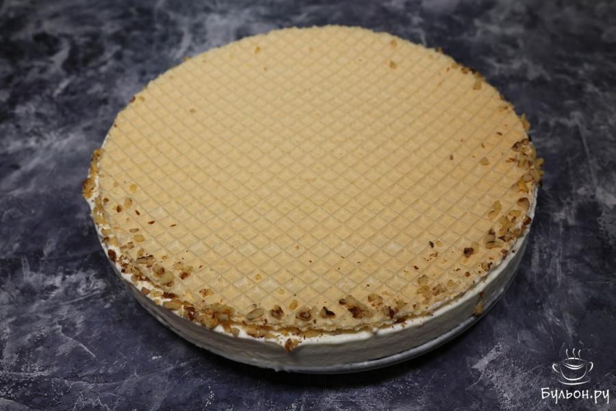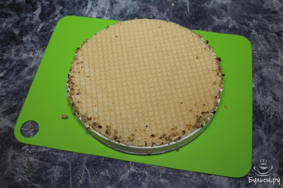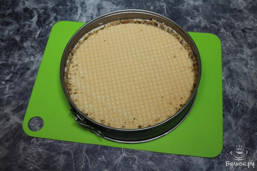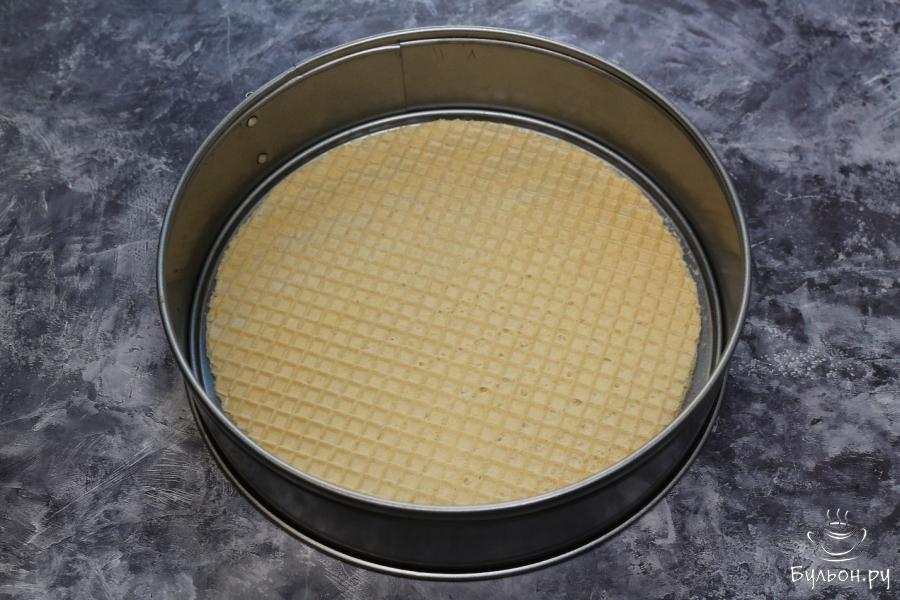 3. Берем разъемную форму и кладем корж из вафли. Затем выливаем только что приготовленное будущее мороженое, разравниваем его.