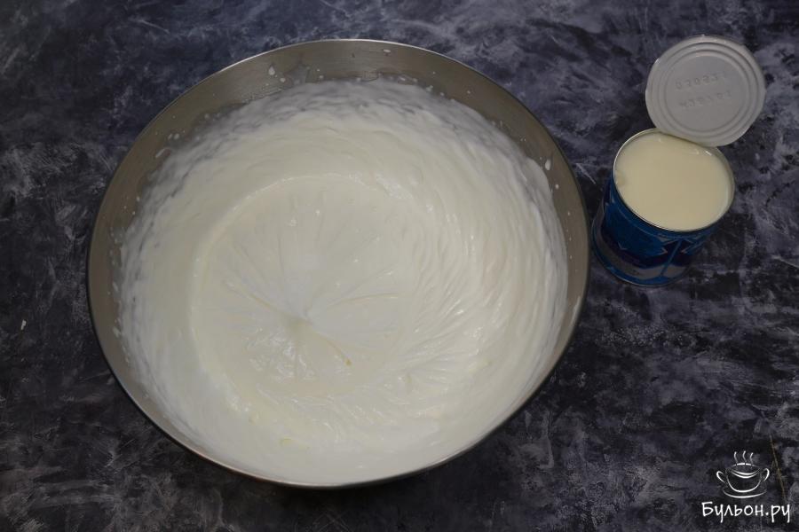 2. Снова включаем миксер, но уже так, чтобы он не взбивал ингредиенты, а просто перемешивал их. Потихоньку добавляем сгущенку, ванилин, и выключаем миксер.