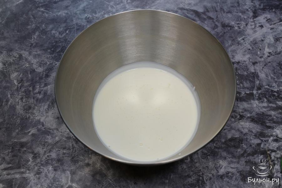 1. Берем большую миску, вливаем весь объем сливок 35% жирности, хорошо взбиваем. В итоге сливки должны стать воздушными. Проверяем их готовность просто выключая миксер и поднимая венчик. Если сливки не капают и остаются пышной шапочкой на нем, то значит, что сливки доведены до нужной консистенции.