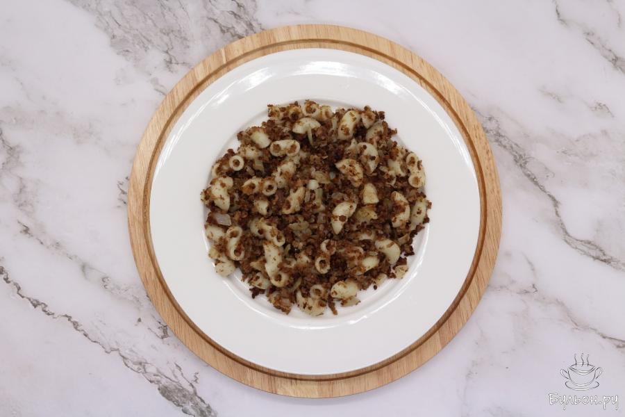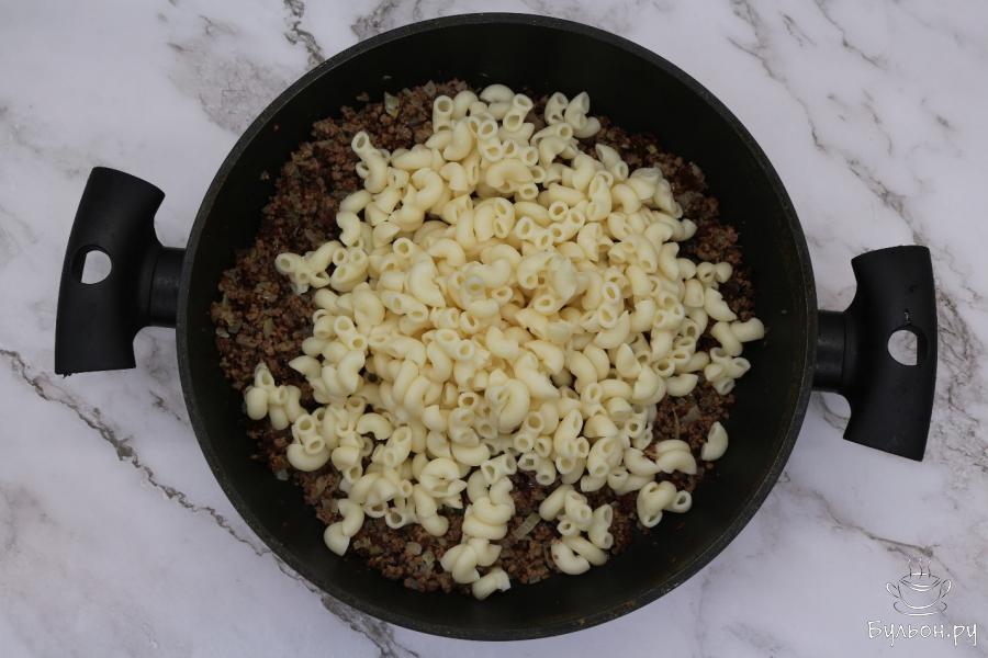 8. Затем выкладываем макароны, перемешиваем их с другими ингредиентами и прогреваем заодно. Снимаем пробу и при необходимости досаливаем блюдо.