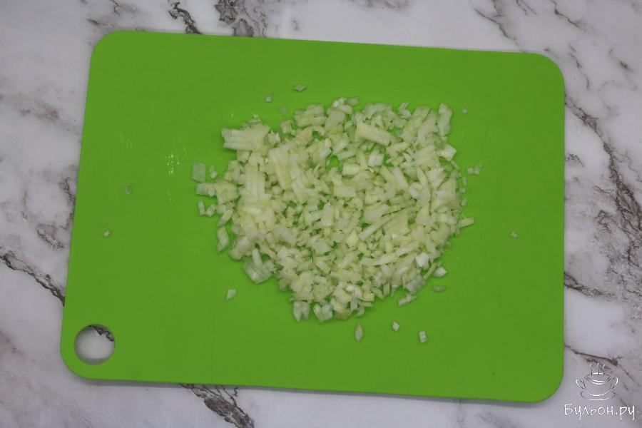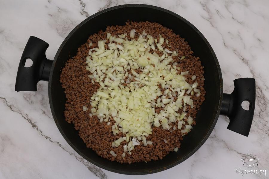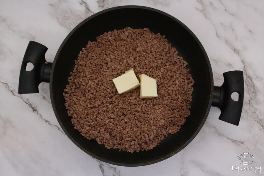 6. На сковороду выкладываем фарш, кладем кусочек сливочного масла. Обжариваем его в течение нескольких минут, после чего добавляем лук.