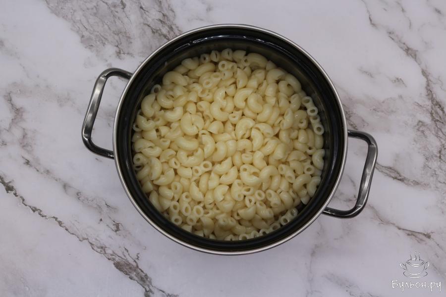 2. В это же время можно отварить макароны. Варим их согласно инструкции на упаковке, до полной готовности. После промываем их под проточной холодной водой и оставляем в дуршлаге для того, чтобы вся вода стекла.