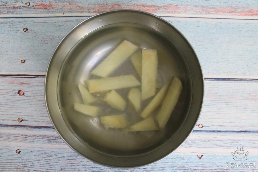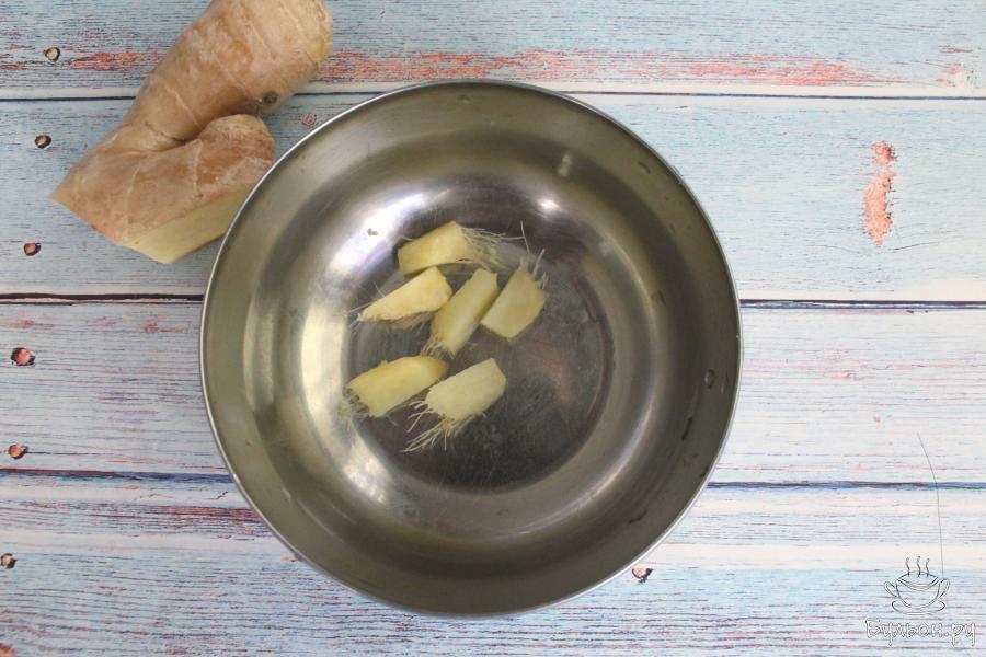 1. Для начала, нам нужно приготовить имбирный сироп. Для этого, корень имбиря промываем, чистим, нарежем его небольшими брусочками и зальем 300 мл. негазированной воды.