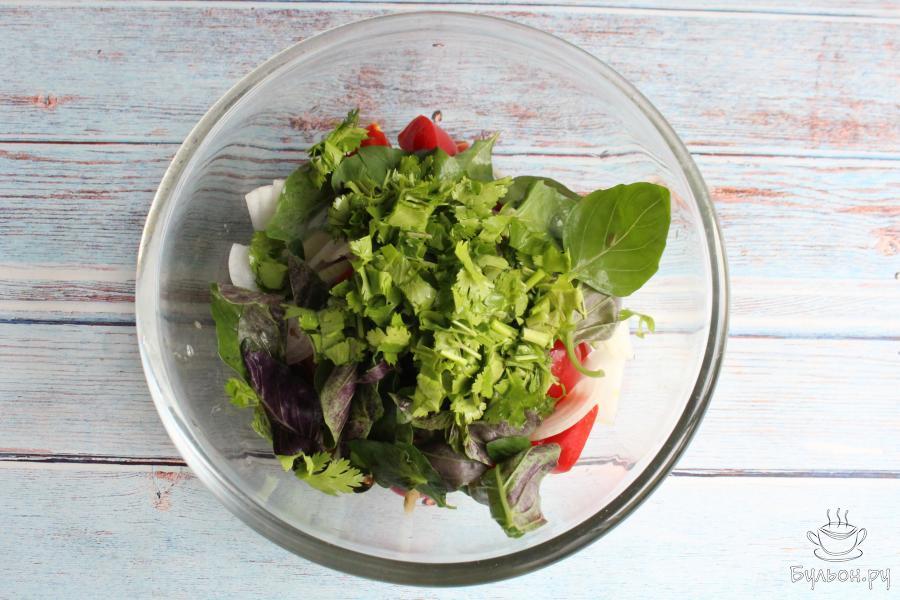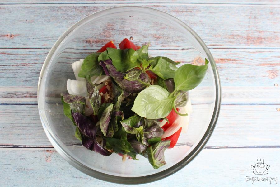 5. Базилик промоем, обсушим и добавим листья в салат. Если есть очень крупные листья, можно их разорвать на несколько частей.