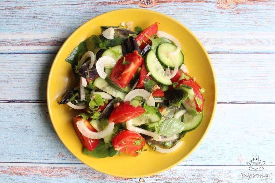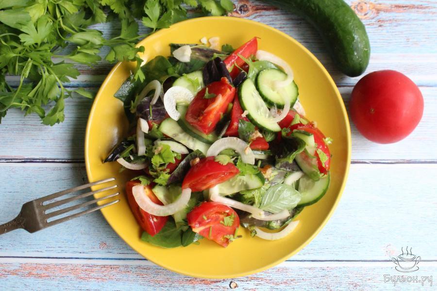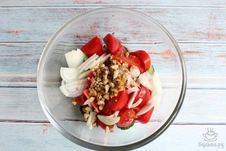 Если вы хотите устроить себе разгрузочные дни, то салаты лучше готовить без майонеза. Салат с помидорами, огурцами и грецкими орехами, отлично подходит для разгрузочных дней. Салат получается легкий, очень сочный, душистый, полезный и вкусный. Для приготовления такого салата, желательно выбирать небольшие, плотные и сладкие помидоры. По желанию, в салат можно добавить измельченный, свежий, острый перец. Готовится салат за считанные минуты.