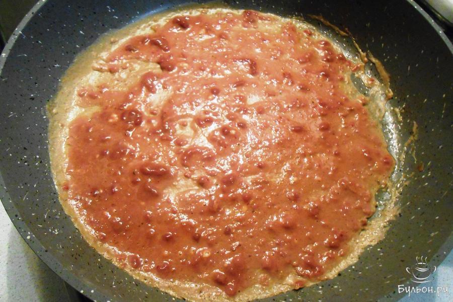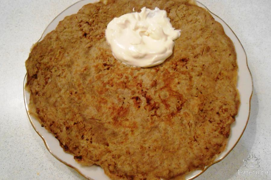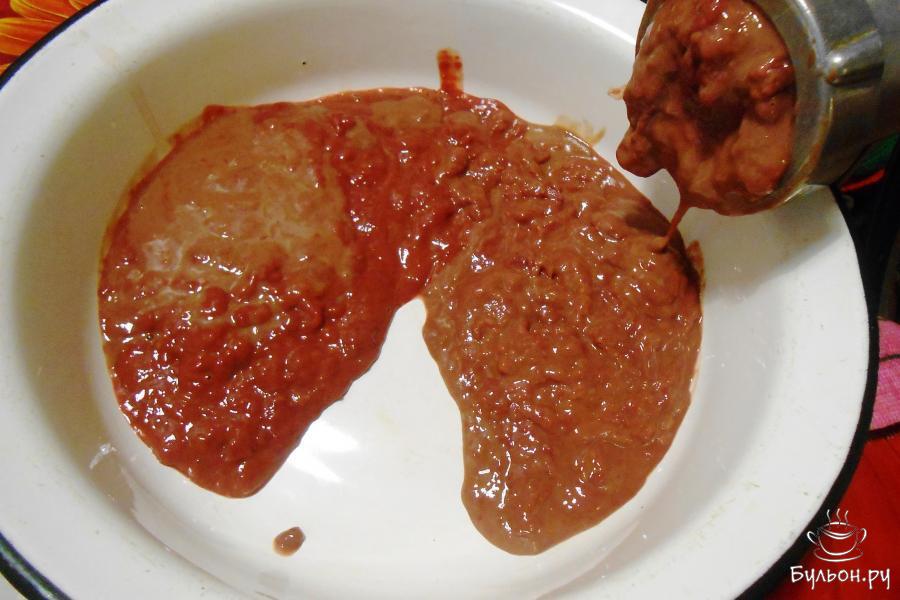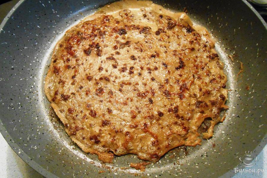 5. Налить на раскаленную сковороду с растительным маслом немного печеночного теста и жарить до румяности на среднем огне.