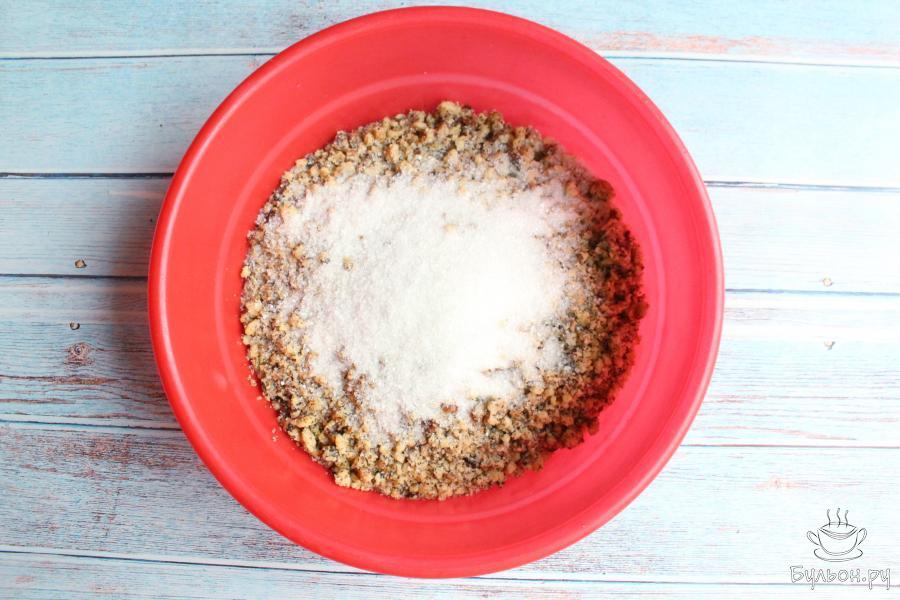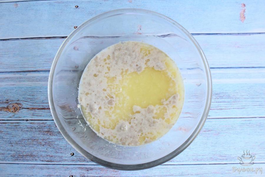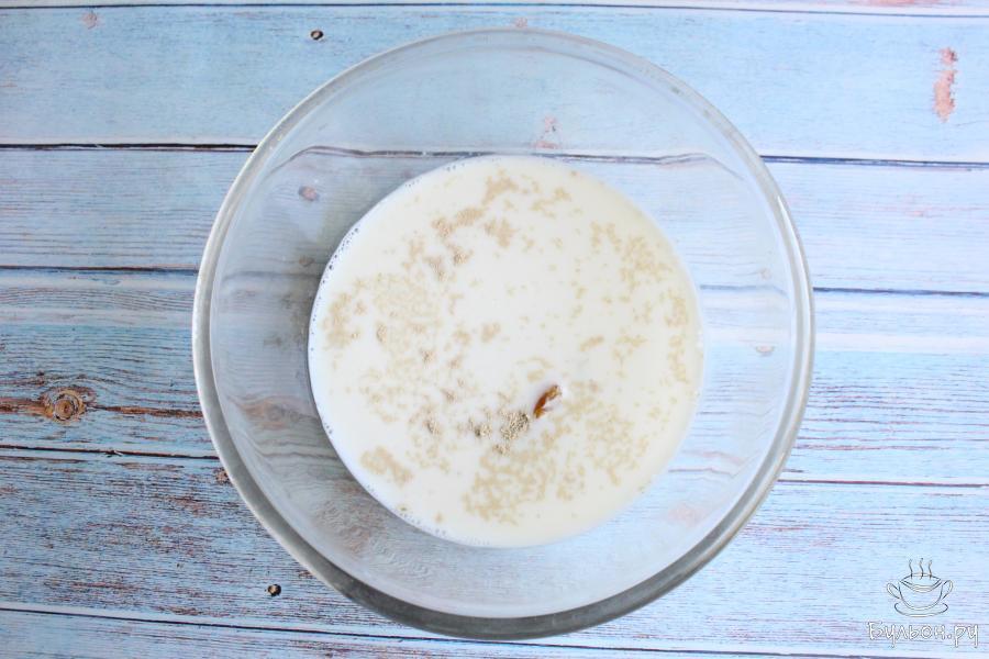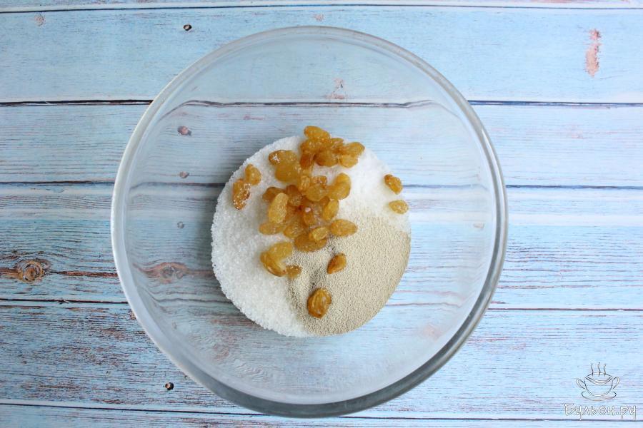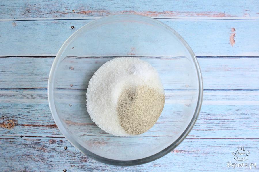 1. В глубокой чашке смешиваем сахар, соль и дрожжи. От общего количества сахара, оставим 2-3 ст. л. для начинки.