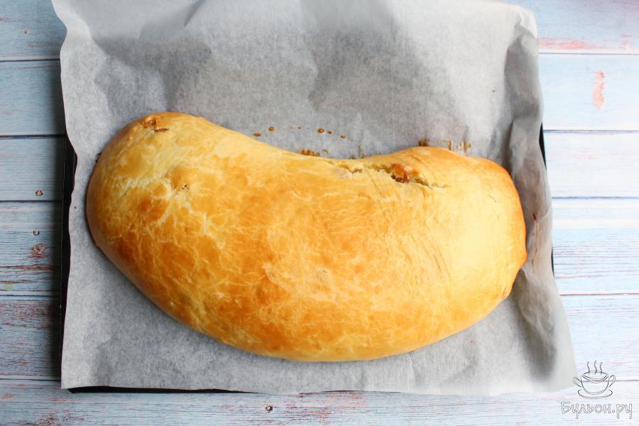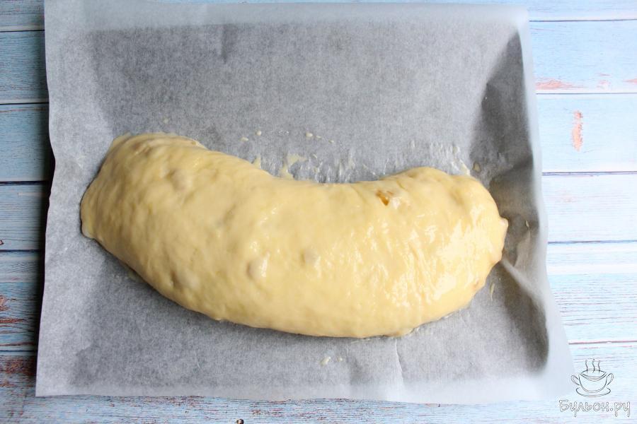 11. Заворачиваем тесто в рулет и выкладываем его на противень застеленный пергаментом. Пусть рулет постоит минут 15 в тепле. Рулет смазываем тем, чем привычно: взбитым яйцом, молоком, маслом.