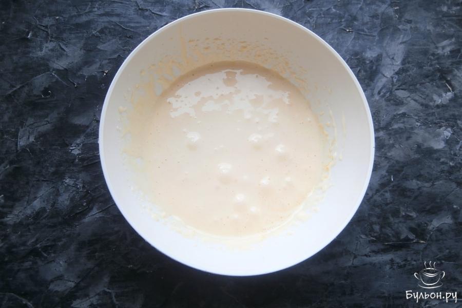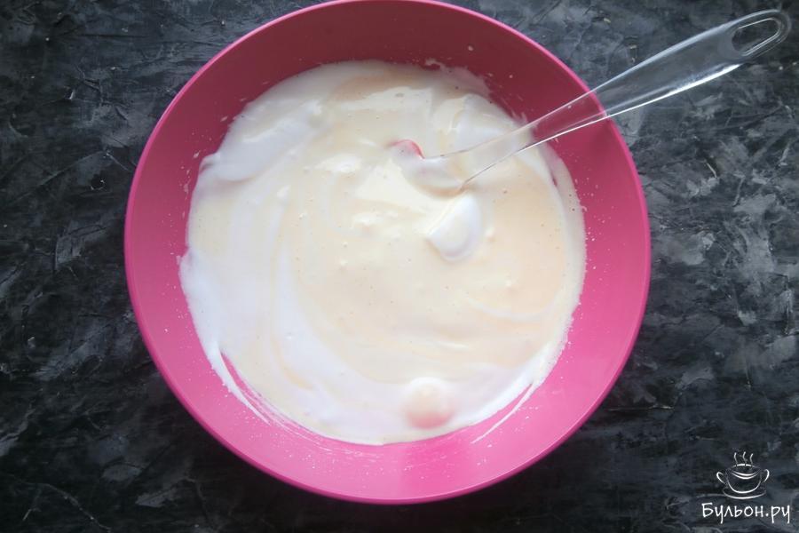 2. Разделив яйца на белки и желтки, взбить первые со щепоткой соли до пышности, далее, постепенно всыпая 50 г сахара, продолжать взбивать белки до мягких пиков. Долго взбивать нельзя (до крепких пиков), корж будет трескаться и при выпечке станет сухим.