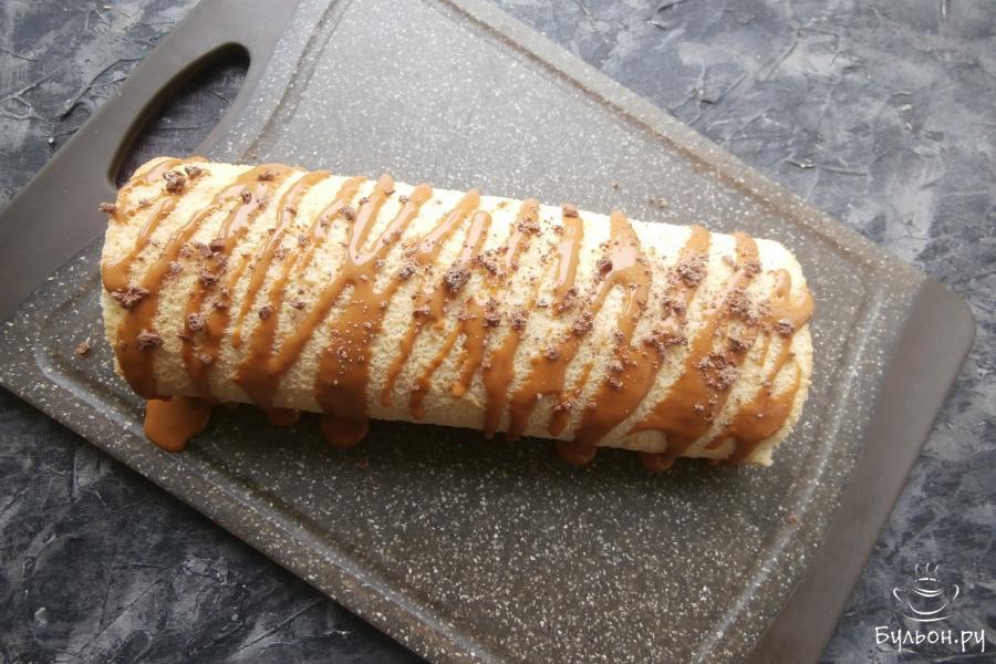 14. Далее, края рулета обрезать и украсить его сверху той же смесью из сгущенки (ее немного останется). Также, можно посыпать рулет сверху тертым шоколадом. Отправить рулет в холодильник еще на 30 мин.