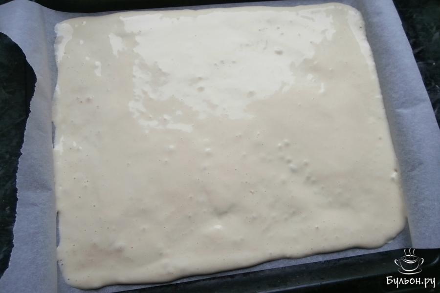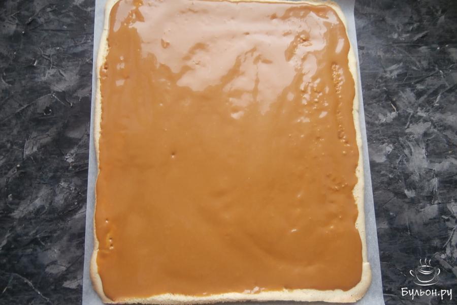 12. Корж перевернуть еще на один лист пергамента и смазать подготовленной смесью из сгущенного молока. Оставить корж в таком положении минут на 5-7, чтобы он пропитался этой смесью.