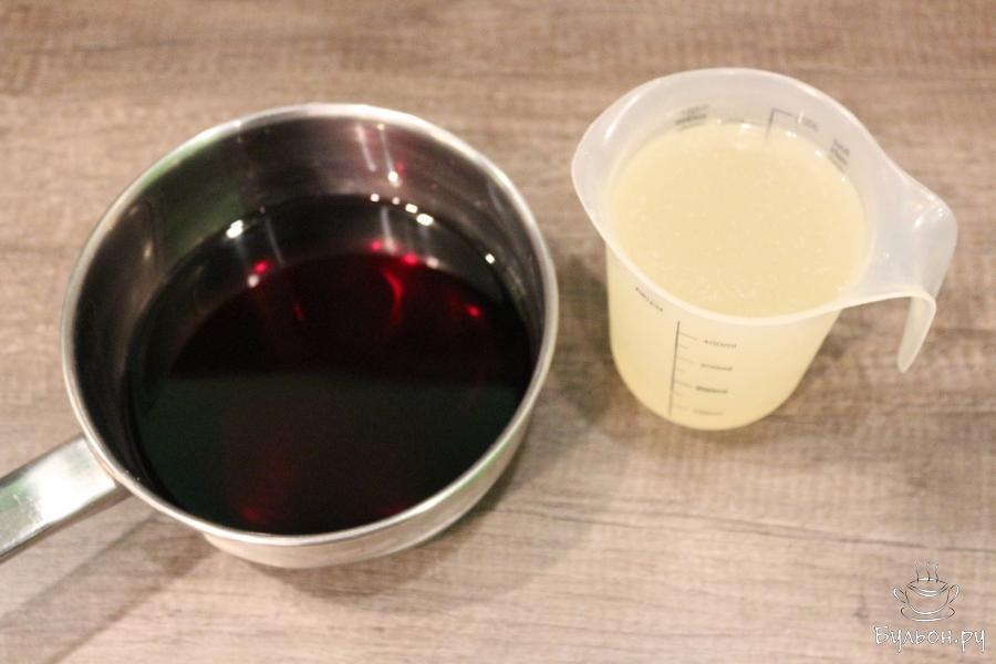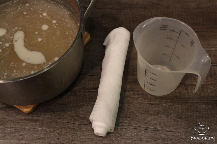 2. Говяжий бульон лучше отварить накануне. Его обязательно процеживаем через марлю, чтобы в соус не попали косточки, кусочки мяса. Вливаем в ковш красное сухое вино и бульон, доводим их до кипения, после чего уменьшаем огонь и выпариваем соус 1 час.