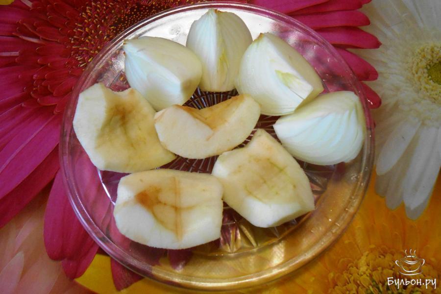 3. Почистить яблоко от кожуры и семян, разрезать на 4 части. Почистить лук, помыть и разрезать на 4 части.