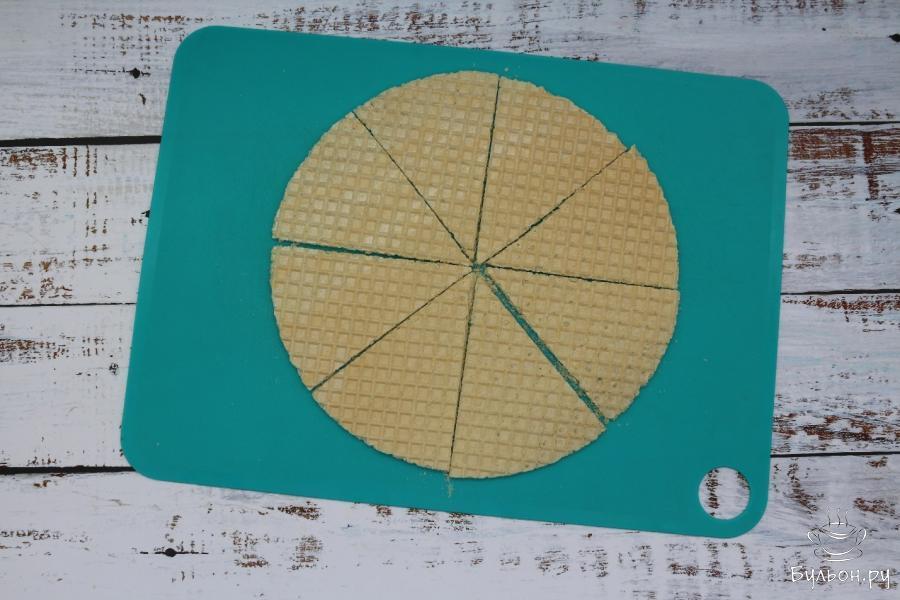 2. Возьмем вафельные коржи и острым ножом нарежем их на порции. У меня получилось с каждого коржа по 8 порций.