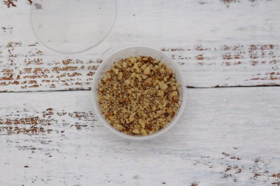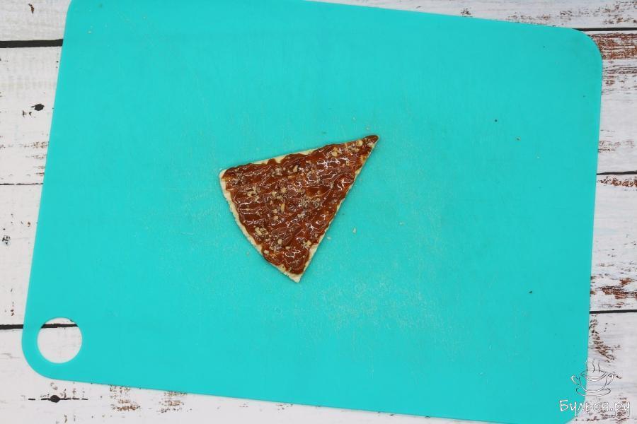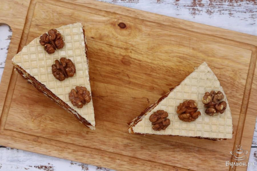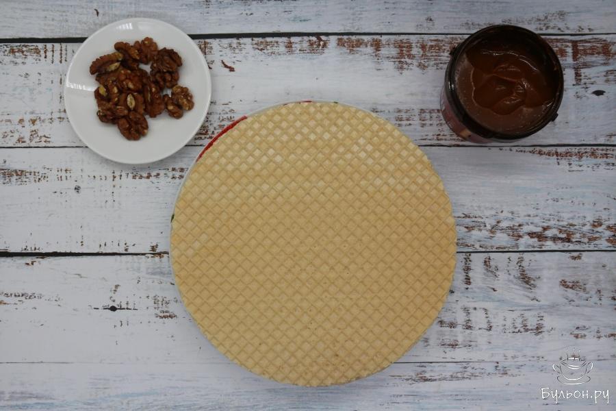 4. Теперь берем один кусочек вафли и промазываем ее вареной сгущенкой, посыпаем измельченными грецкими орехами.