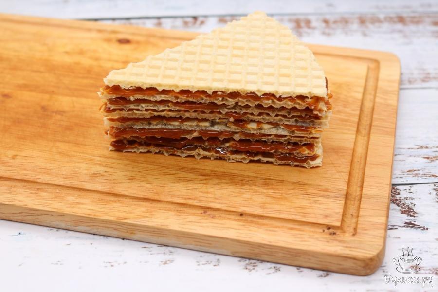 Использовала вафельные коржи для одного рецепта у меня остались неиспользованные. Так как они после открытия со временем набираются влаги и уже становятся не пригодны к использованию, то их срочно нужно куда-то реализовывать. Вот я и подумала, что приготовлю из них вафельное пирожное с вареной сгущенкой. Минимум ингредиентов, минимум времени на приготовление и максимум удовольствия. Быстро, просто и очень вкусно.