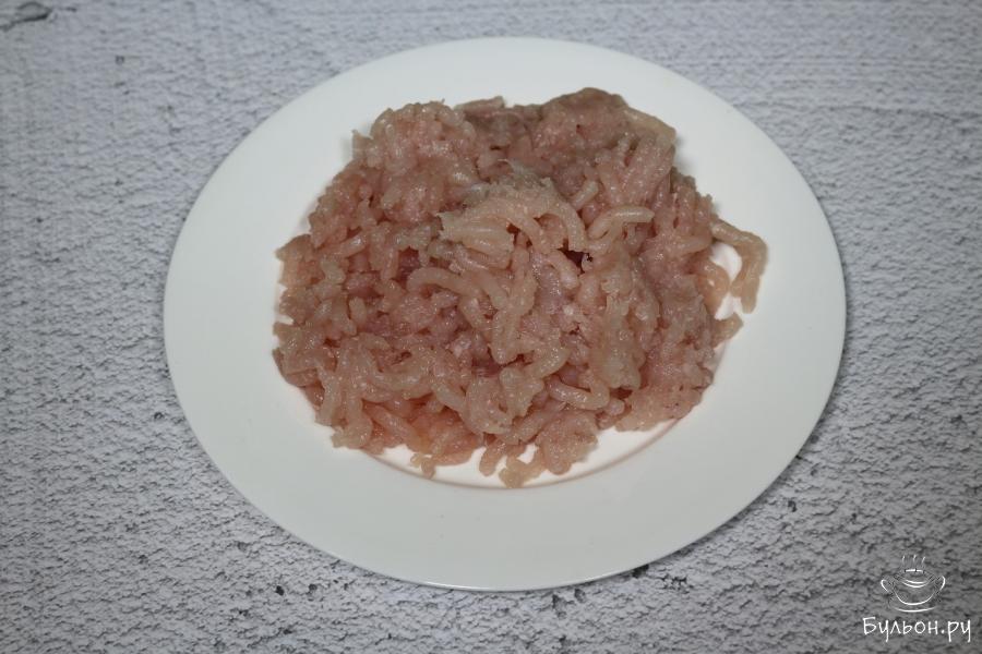 5. В это время пропускаем куриное филе через мясорубку. Когда сока от помидор в сковороде не останется, добавляем фарш, перемешиваем и продолжаем тушить.