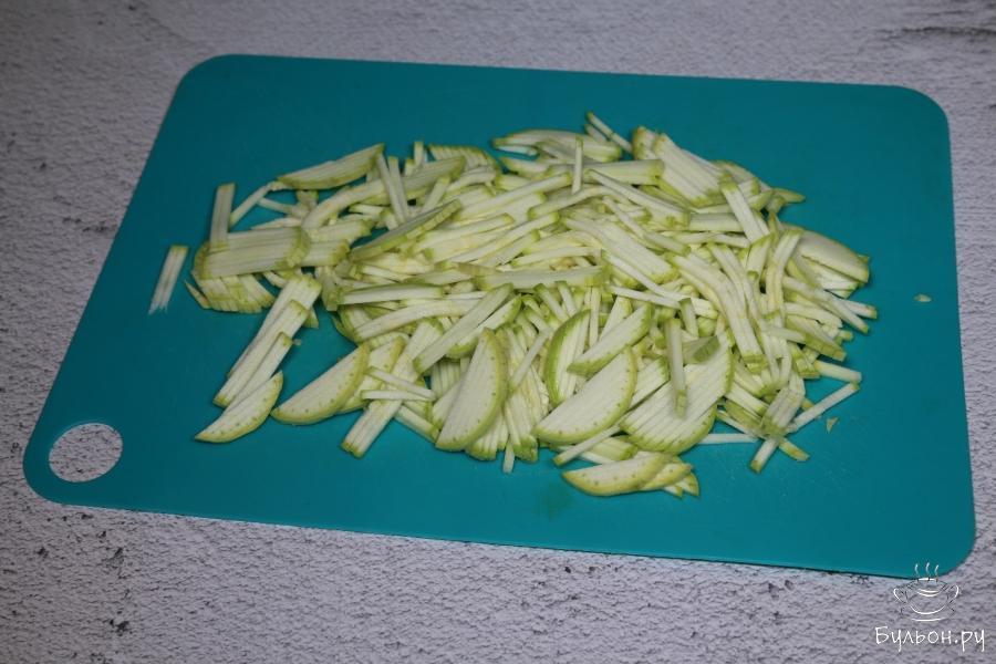 6. Кабачок превращаем в тонкую соломку. Я это делаю при помощи специального слайсера. Добавляем его почти к готовому блюду, солим, перемешиваем и тушим еще несколько минут.