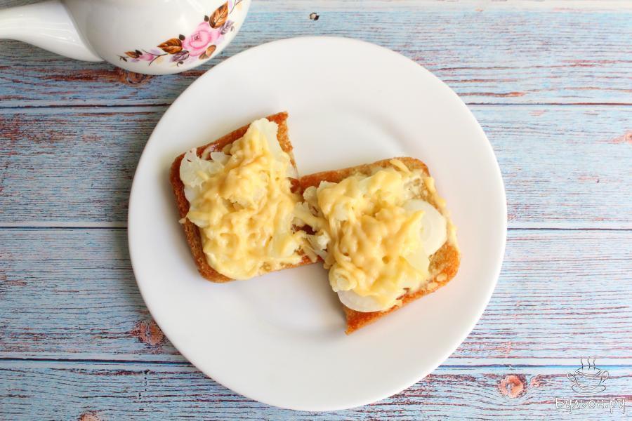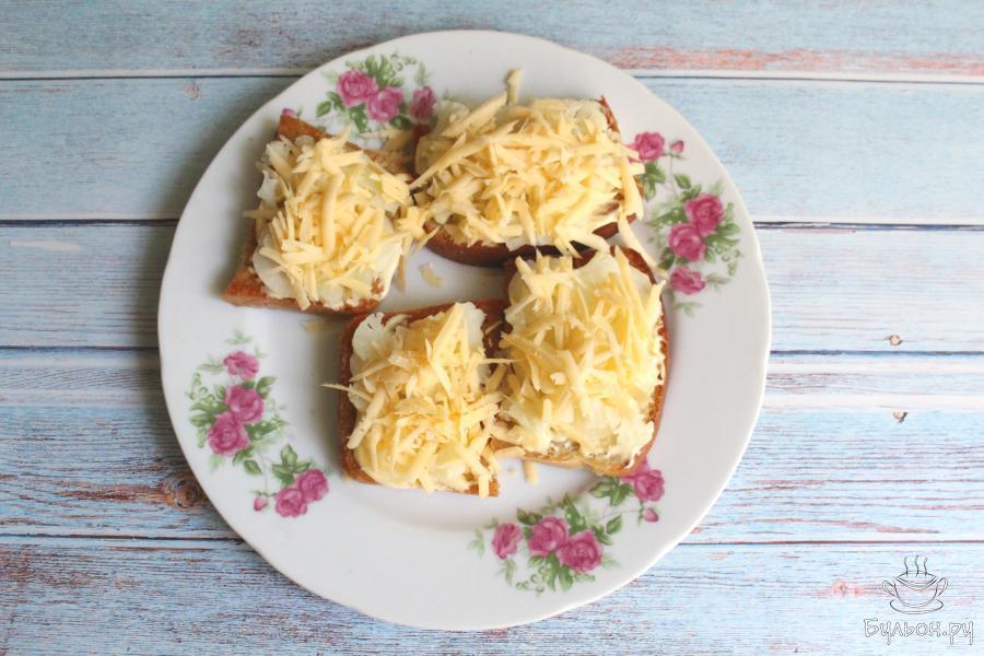 6. Сыр перетираем через крупную терку и выкладываем его на капусту. Отправляем бутерброды либо в разогретую до 180 градусов духовку на 6-7 минут, либо на разогретую сковороду под крышку. Это нужно для того, чтобы бутерброды стали горячие, а сыр расплавился.