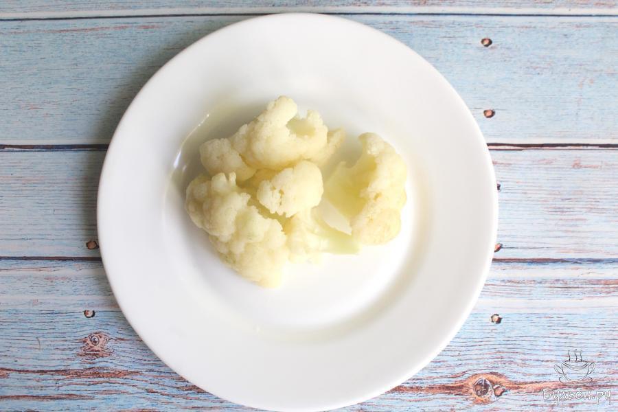 1. Цветную капусту разберем на мелкие соцветия, промоем и отварим в кипящей воде 6-7 минут. Воду сольем.
