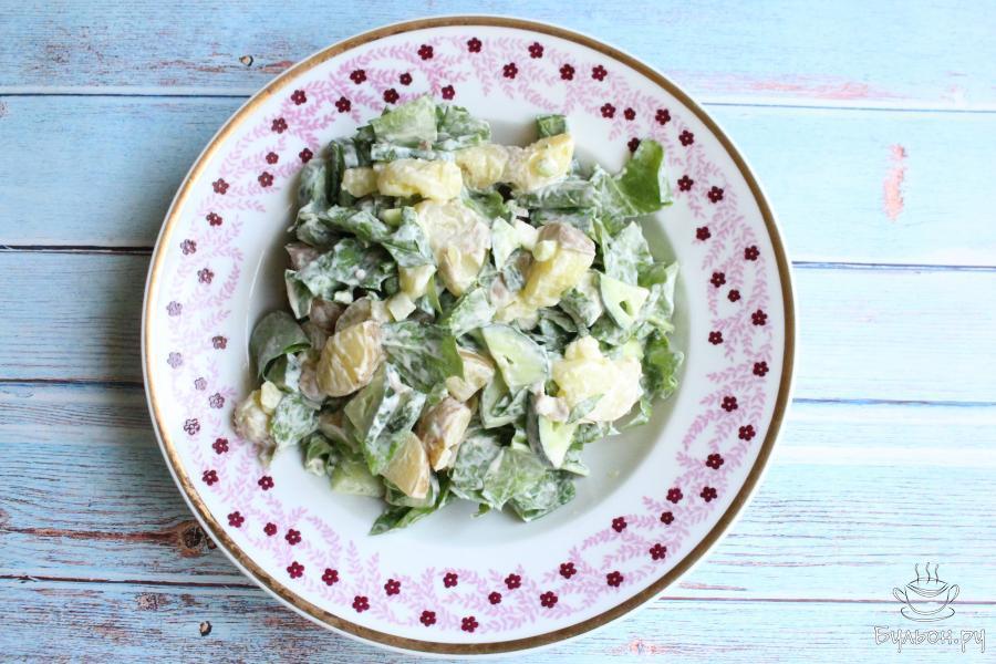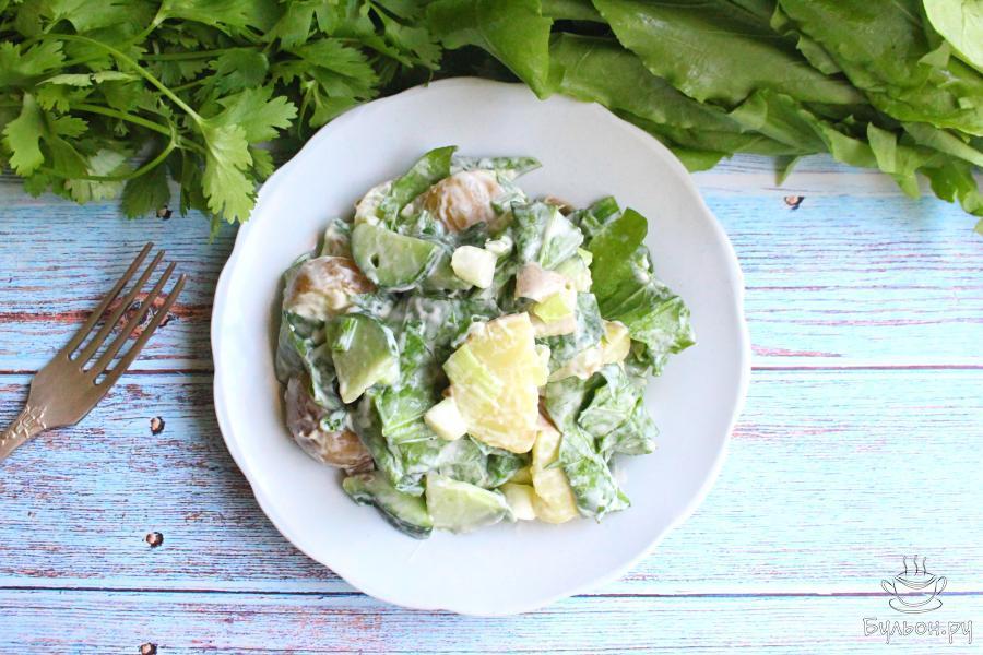 Картофельный салат со щавелем и свежими огурцами, получается вкусный, сытный и насыщенный, с приятной кислинкой и одновременно легкий. Для приготовления такого салата, нужен молодой, мелкий картофель, он нежный и его даже не придется чистить. По желанию такой салат можно заправить сметаной или постным майонезом и получить блюдо для вегетарианского и постного стола. Попробуйте приготовить такой салат, он наверняка понравится всей семье.