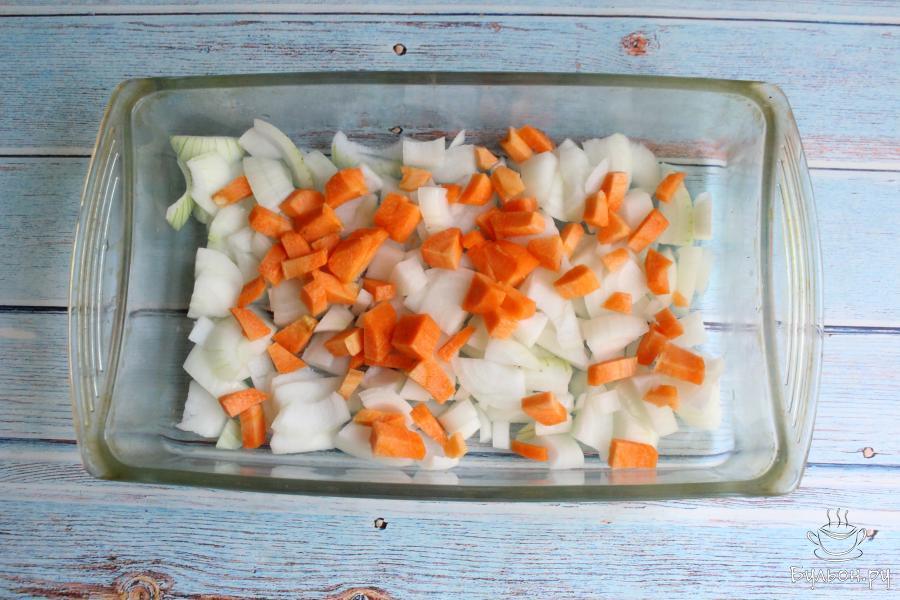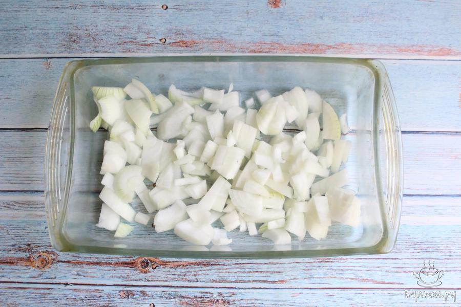1. Лук почистим, промоем, мелко нарежем и выложим его в форму, смазанную растительным маслом. Все слои солим по своему вкусу.
