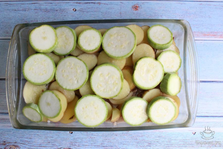 4. Молодой мелкий картофель хорошо промываем, нарежем кружочками и выкладываем следующим слоем. Солим.