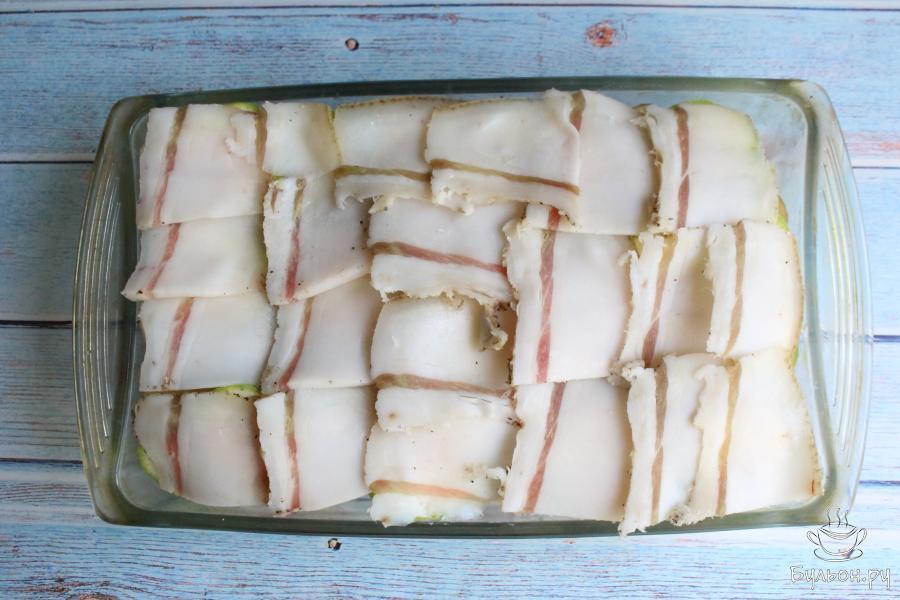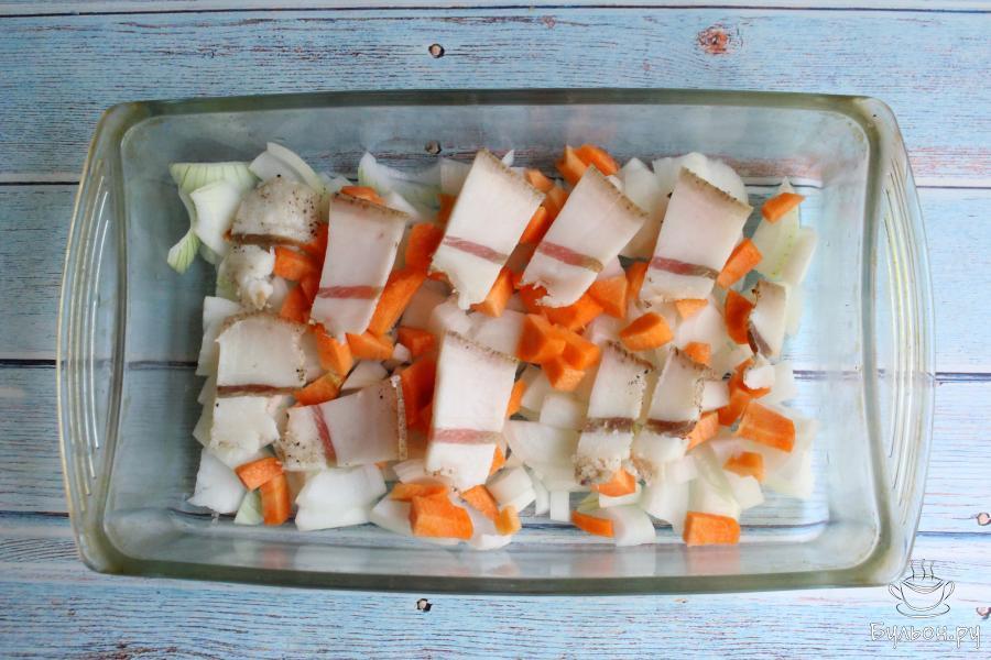 3. Сало нарежем тонкими пластинками и выложим на морковь. У меня домашнее сало уже с черным перцем, если у вас сало без перца, то можно, по желанию, добавить перец.