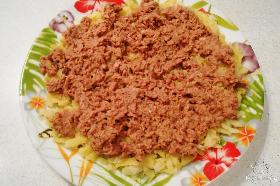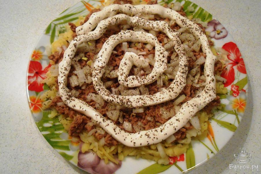 Яркий салат "Подсолнух" - это популярный салат для оформления праздничного стола. Для украшения используют желтки, майонез для сеточки, маслины без косточек для семечек и конечно же картофельные чипсы овальной формы. Украшение много времени не займет. Интересно, что любой слоеный салат можно так украсить. Я приготовила салат с тунцом, солеными огурцами и картошкой без добавления курицы, грибов и кукурузы. Использовала консервированный салатный тунец в масле.