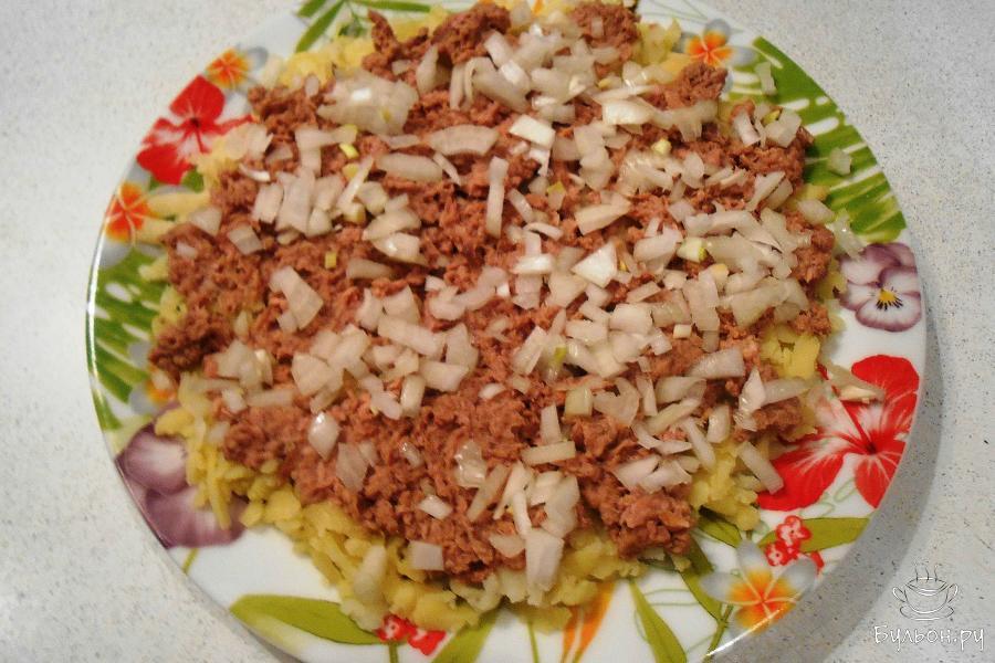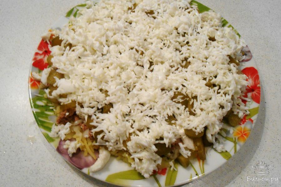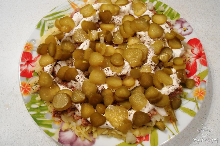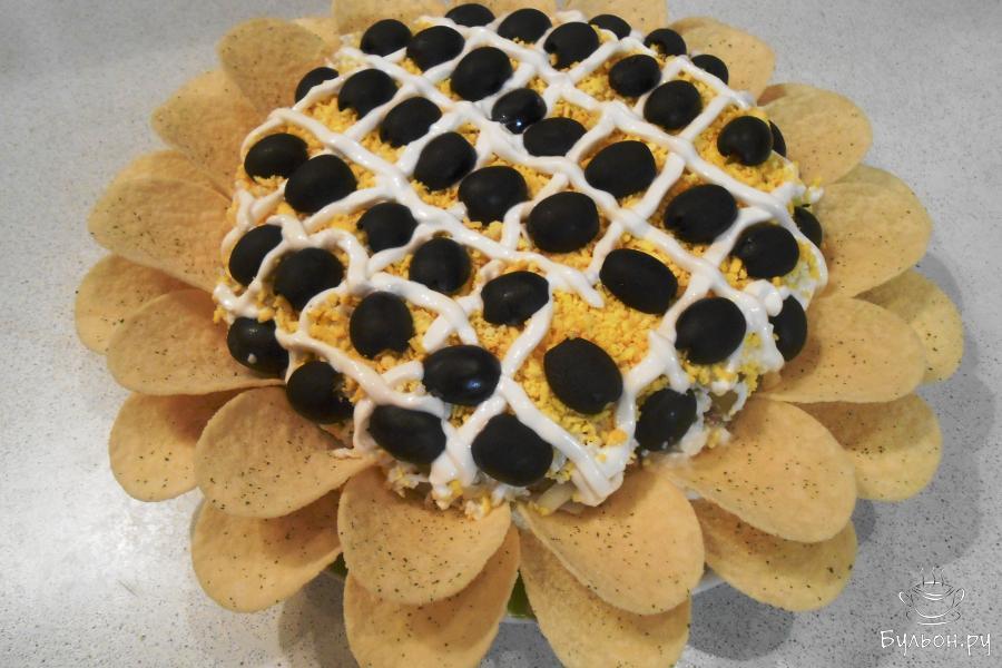 13. Выложить половинки маслин в майонезную сеточку. Воткнуть по краю овальные чипсы в два слоя. Слоеный салат "Подсолнух" с консервированным тунцом, картошкой, солеными огурцами и чипсами готов. Охладите или сразу подавайте к столу. Приятного аппетита.