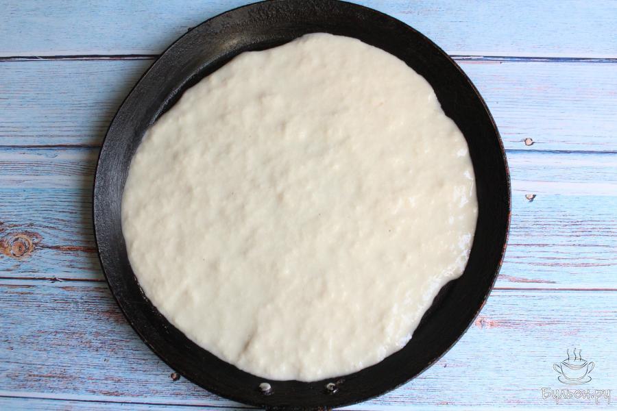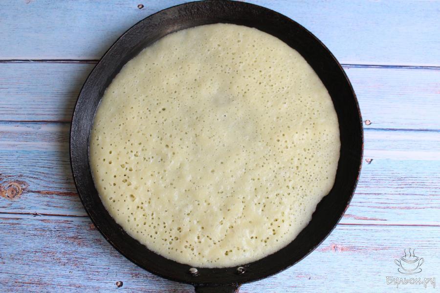8. Жарим блин с одной стороны несколько минут. Нужно, чтобы верх блина стал сухим и появилось много дырочек, тогда блин готов. Блин снимаем, сковороду остужаем и жарим следующий блин.