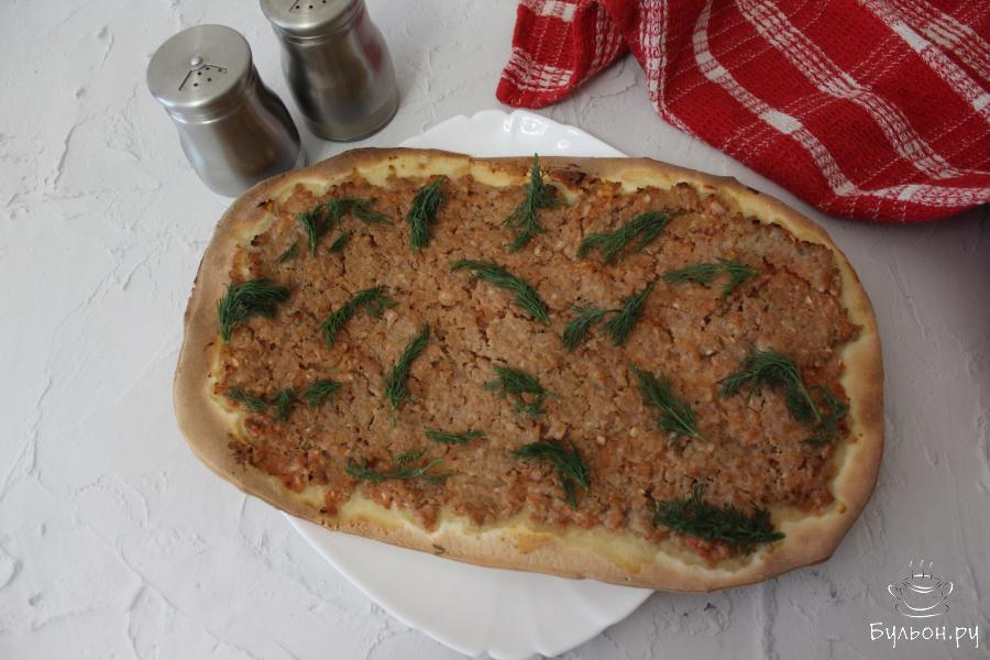 6. Готовую лепешку достаем из духовки, выкладываем на тарелку и посыпаем зеленью. Турецкая лепешка с фаршем Ламаджо в домашнем исполнении готова.