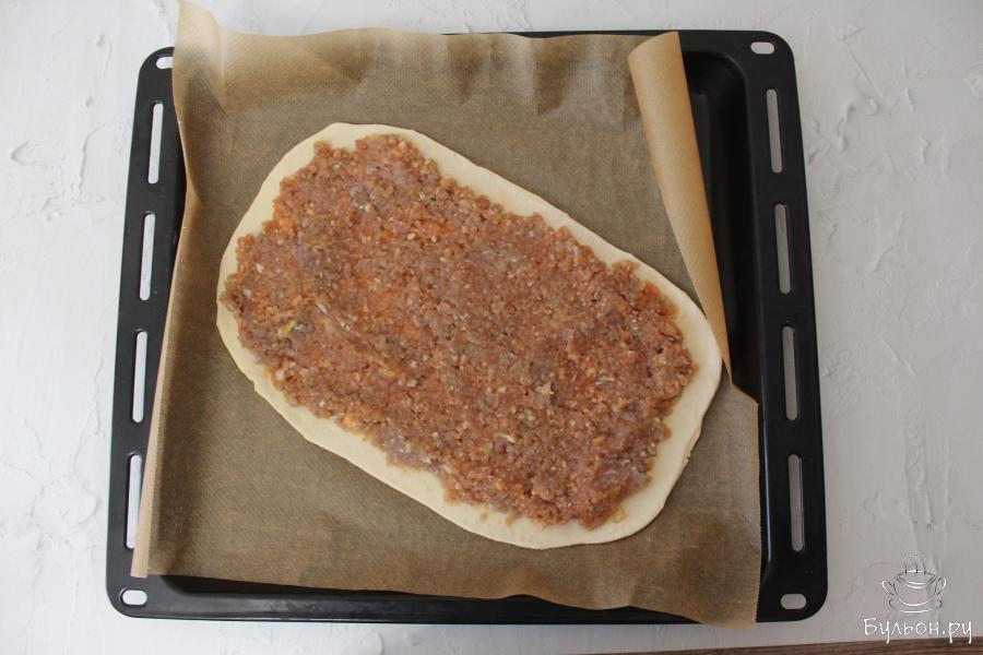 4. На противень кладем пергамент, сверху лепешку из теста, на само тесто выкладываем настоявшийся в холодильнике фарш и размазываем его ложкой по всей лепешке.