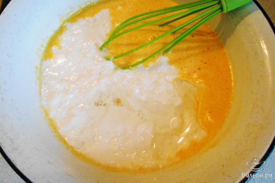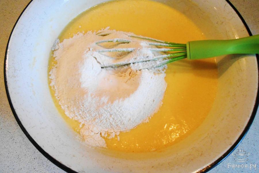 3. Всыпать просеянную муку, смешанную с содой. Хорошо смешать до однородной массы. Когда сода вступит в реакцию с кефиром, на поверхности начнут появляться мелкие пузырьки.