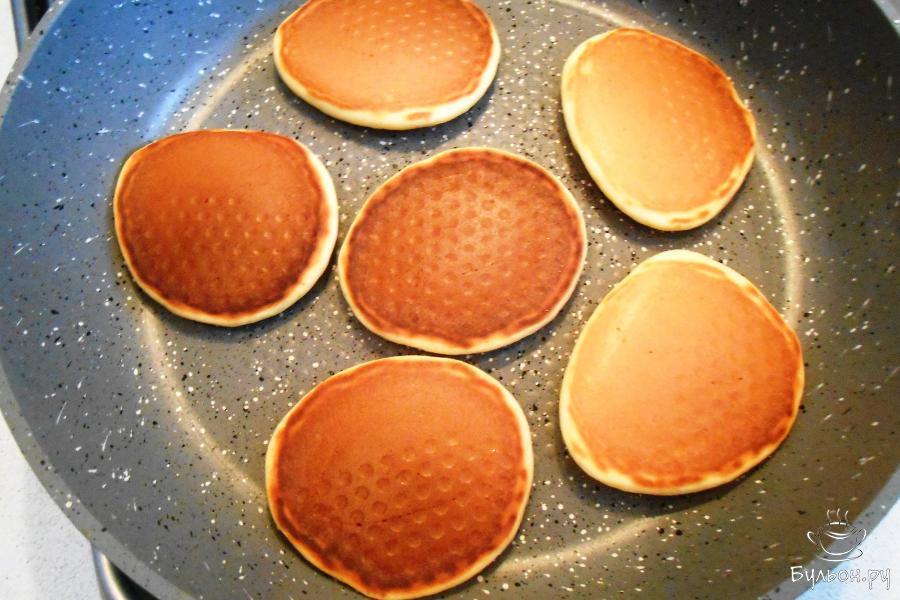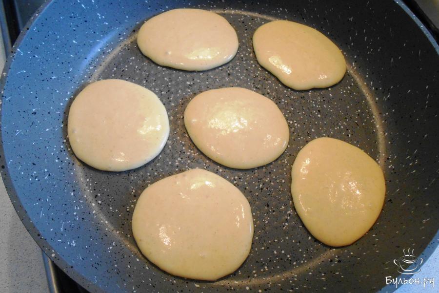 5. Перевернуть и жарить с другой стороны до румяности. Вкусные, пышные оладьи на кефире с содой готовы. Приятного аппетита.