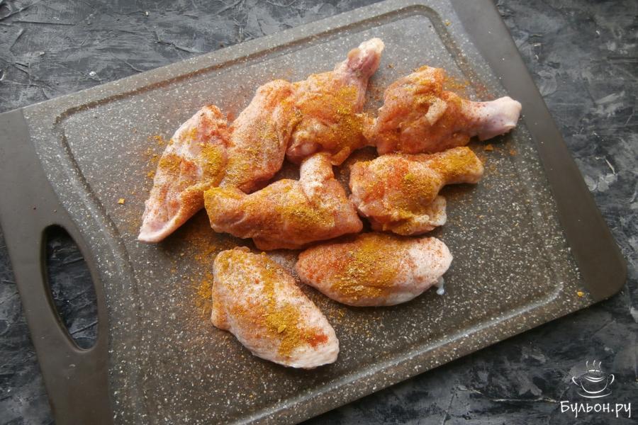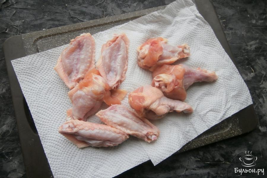 1. Куриные крылышки помыть, разрезать на 2 части по суставу, кончики отрезать. Обсушить крылышки на бумажном полотенце.