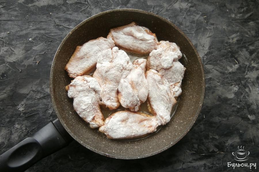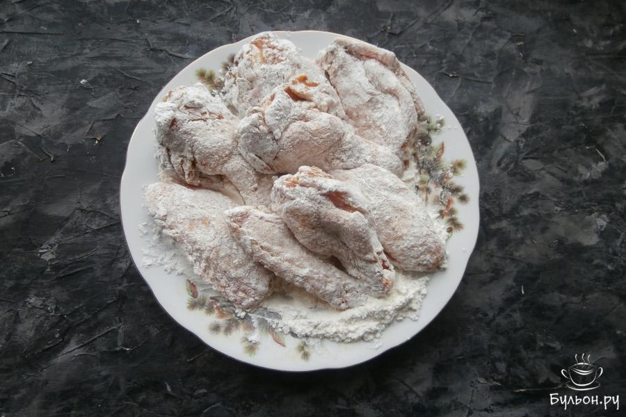 4. Хорошенько, со всех сторон обвалять крылышки в полученной сухой смеси, поместить их в холодильник на 50-60 минут. Затем, достать крылышки из холодильника и снова обвалять в крахмально-мучной смеси.