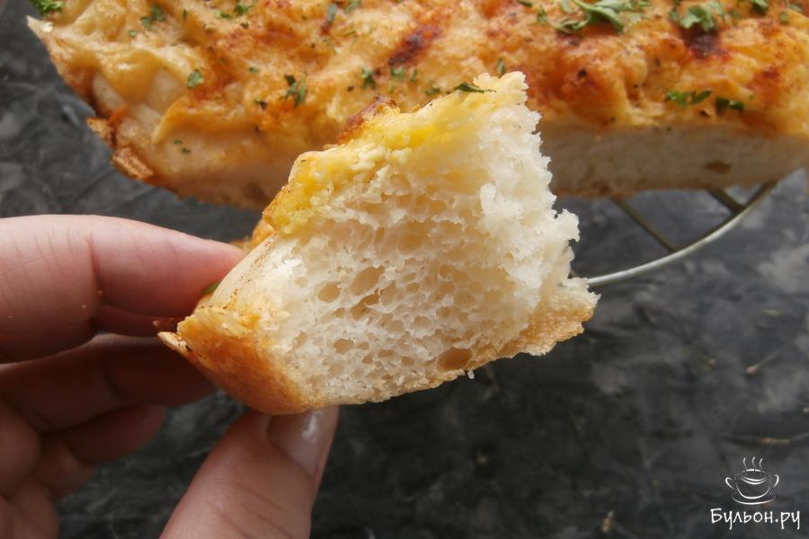 9. Остудить фокаччу на решетке до теплого состояния. В охлажденном виде хлебушек также хорош. Структура этого хлеба просто замечательная.