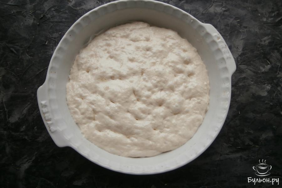 6. Форму (у меня д.26 см) смазать немного маслом и выложить жидкое тесто, которое сбрызнуть оставшимся маслом и пальцами вдавить его в жидкое тесто. Тесто оставить в покое мин. на 10-15. Выпекать фокаччу в горячей духовке при 180 град. 15 мин.