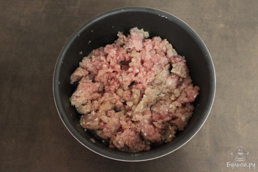 3. В это время пропустить мясо с луком через мясорубку, приправив солью и перцем по своему вкусу, перемешать.