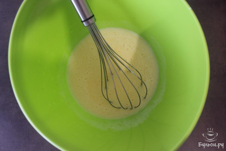 1. В теплый кефир положить соду и перемешать. В емкость, в которой будет замешиваться тесто, разбить яйца, всыпать 1 ч. л. соли и сахар, взбить венчиком. Сюда же перелить пенистый кефир и еще раз взбить венчиком.