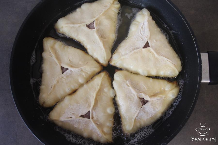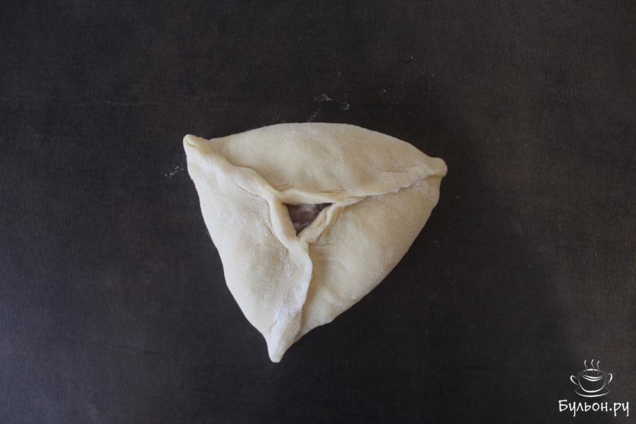 4. Через 30 минут, как было указано ранее, разделить тесто на 12 частей и скатать их в небольшие шарики. Каждый шарик раскатать в лепешку, выложить мясную начинку и защипнуть края так, чтобы получился треугольник, оставив в центре небольшую дырочку.