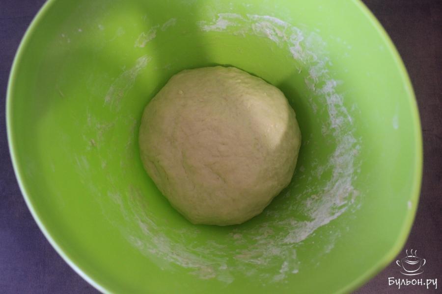 2. Ввести частями муку и замесить тесто. В несколько приемов ввести 2 ст. л. растительного масла и замесить эластичное тесто. Сформировать из теста шарик и накрыть емкость с тестом пленкой, отставить в сторону на 30 минут.